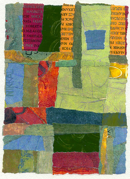 The paper substrate is printmaking paper - BFK Rives and Arches Cover. The collage papers are a mix of hand painted papers (I paint acrylic on all kinds of papers, including pages torn from magazines like Wired and Art News - the concept is to embed words and letter fragments in paint). Some of the papers are fragments from color copies of other collages. I used Cranes 100% rag paper for the copies. All the papers are hand torn and placed one at a time. I use Gluefast white PVA glue. Each work was coated with a mix of matte and gloss acrylic medium. |