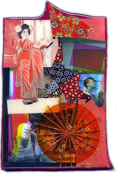 Collage on shaped wooden panel, set in clear resin